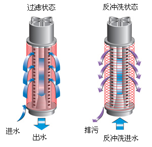 水通过叠片过滤器的进水口进入叠片过滤器内部,水中一些较大的杂质被阻挡在过滤叠片的外部进行表层过滤后,水流通过叠片之间的凹槽(唯一通道)深入滤芯内,对剩余的杂质进行深层过滤后,过滤完毕的水被引向出水口,重新进入水循环系统。